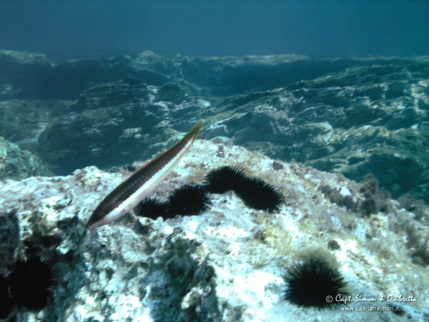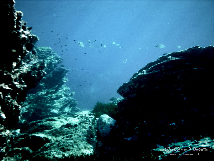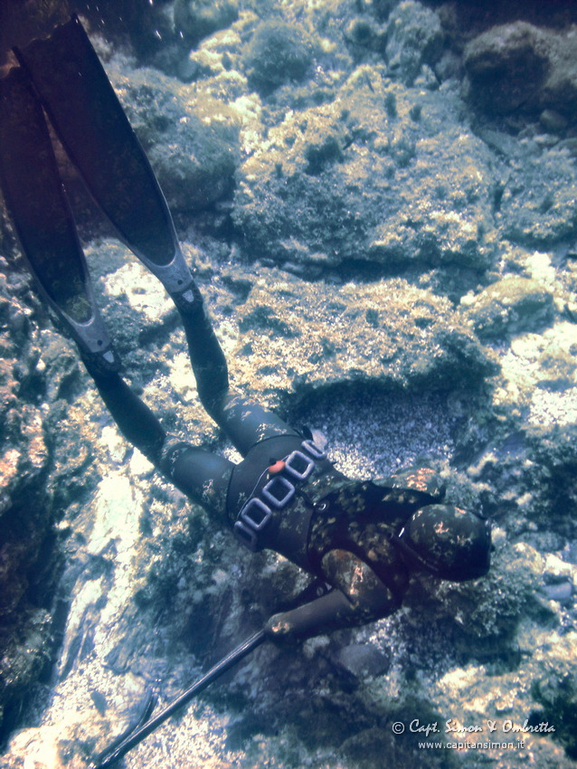 In breve, l'acqua si dimostrerà assolutamente gelida per la stagione: taglio freddo, 17°C oltre gli 8 metri son davvero pochi, troppo pochi, tipici valori di maggio più che di agosto... tanto da sentir stilettate di brividi all'aspetto sotto i 10 mt. Sergio avvisterà una grossa cernia, purtroppo inavvicinabile, mi farà scovare un bel sarago, poi fuggito in tana e io mancherò un bel sarago all'agguato, dimenticando di avere il caro Mr Iron 104 caricato alla prima tacca (per l'esplorazione precedente di uno spacco...). Purtroppo la costa è completamente ostruita da un lunghissimo tramaglio, pure in doppia fila. motivo per cui, quando sui 12 m avvistiamo dei bei dentici lungo una fantastica e scenografica dorsale, questi si dimostreranno nervosissimi, spaventati ed inavvicinabili. Per chiudere, rientrando al tramonto, incrocio un branco di indifferenti barracuda, abbondantemente fuori tiro. Insomma, in teoria trattasi di cappotto, in realtà di una bellissima esperienza, estremamente istruttiva e soprattutto, vissuta in compagnia di un pescasub da cui tutto c'è da imparare, muovendomi tra fondali davvero da favola.