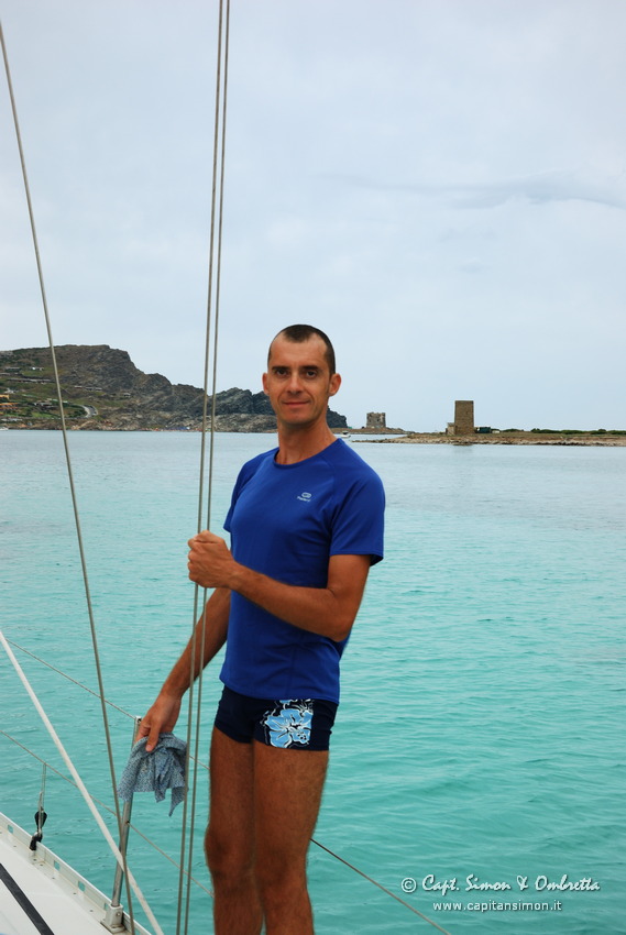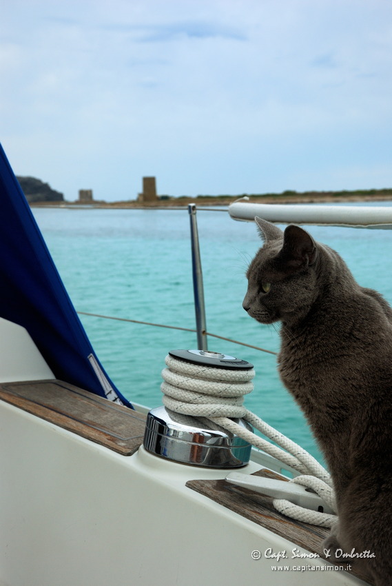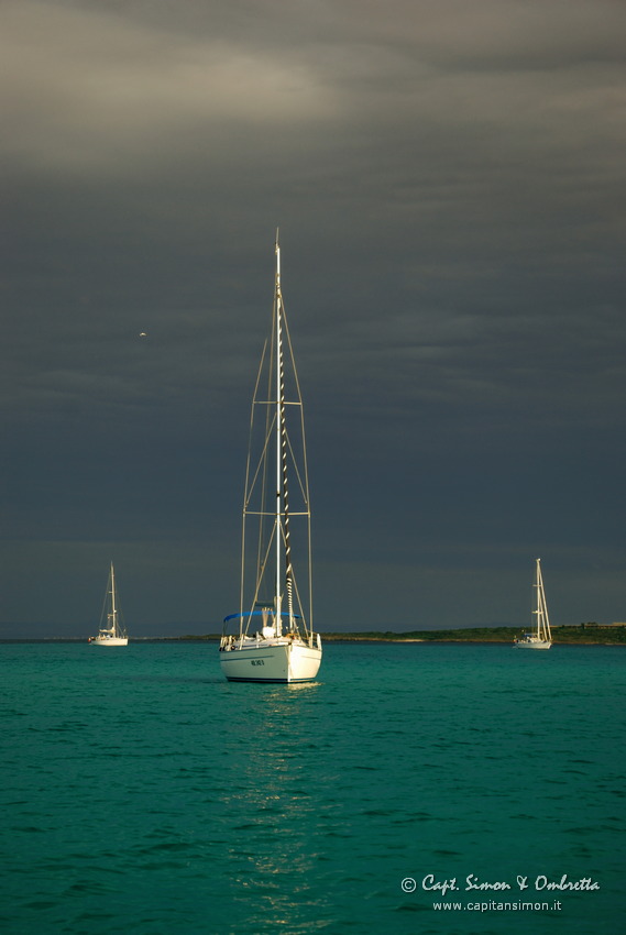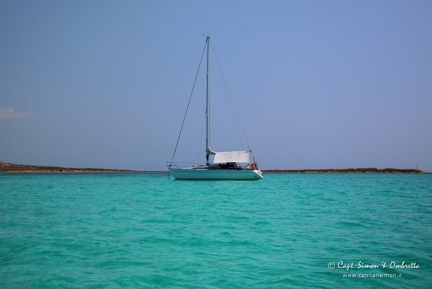 Nei giorni successivi, dal 9 all'11 agosto, decidiamo di fermarci alla rada della Pelosa, i giorni in porto son stati fin troppi, sentiamo ora il bisogno di "star fuori" in mare, sul mare! Alex di White Passion ci ha dato le coordinate precise per ancorare in un punto a ridosso dell'isola Piana, dalla sabbia buona tenitrice, riparato e comfortevole, oltre che paesaggisticamente a dir poco spettacolare. Arriviamo in loco col meteo non proprio esaltante, cielo grigiastro, luce soffusa e la catena dell'ancora pensa bene di adagiarsi a fianco di una specie di rottame residuo di ferro. Non voglio per nessun motivo aver impicci o problemi in caso di fuga rapida, quindi come sempre, decido per rifare l'ormeggio, controllando bene di aver campo libero per 360° attorno all'ancora. Comunque, cielo muffo a parte, questa calmissima e spettacolare rada alla Pelosa, piace anche alla nostra "Pelosa" di bordo! ;-)