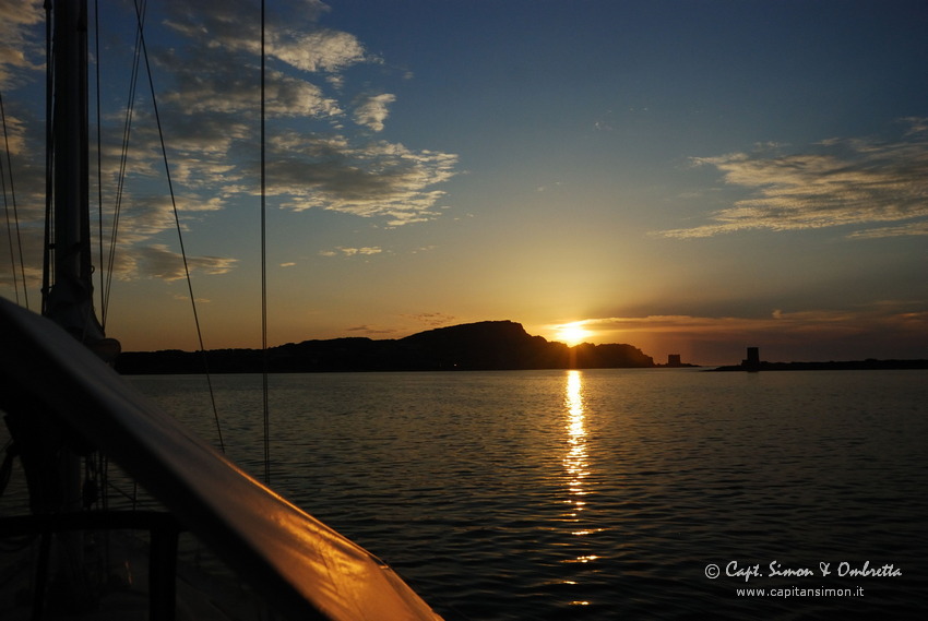 Come immaginavo, il vento non si fa attendere, il trasferimento avviene inizialmente con un gagliardo traversone che vista la sovrainvelatura di Moby Dick ci costringe anche a prender una mano alla randa. E già ce n'è per divertirsi e filar decisi. Preferisco infatti rinunciare alla rotta diretta su Porto Torres, che ci metterebbe il vento al gran lasco se non proprio in poppa. Il tempo non ci fa difetto, meglio seguire la costa, star ridossati (meno onde) e godersi una bella veleggiata come si deve al traverso. Solo all'altezza di Stintino piegiamo un pò ad est, per metter la prua dritta su Porto Torres. Come previsto, man mano che ci allontaniamo dal ridosso, si forma una scomoda onda bassa ma ripida, in piena poppa e il vento segue a ruota... :-( All'altezza di Porto Torres le raffiche sono a dir poco fastidiose, ma i bacini del porto sono ampi e la manovrabilità non fa difetto alla nostra prode barchetta che si destreggia tra pescherecci e banchine in maniera impeccabile.