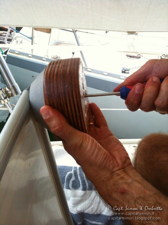 Escludo anche il montaggio sulle draglie, visto su diverse barche e utilizzato in passato proprio su Lady Blues da Roberto. Di questa soluzione non mi convince assolutamente il rischio di rompere il pannello se lasciato in sede, in caso di urto laterale con altre imbarcazioni (è vero che in ferie non siamo quasi mai in porto, ma non son mancate le barcacce che arando o sbagliando ancoraggio ci son finite lungo la fiancata!). O in alternativa, quello di doverlo montare e smontare ogni volta, gironzolando con 8 kg di un ampio pannello in mano, tra gli stretti passaggi del pozzetto e il bel mogano degli interni. Ancor di più, non voglio caricare i candelieri di 8 kg, continuamente appesi, dondolanti notte e giorno! Ci pensano già i vicini di banchina di una barca charter a strattonarli e sinceramente, il lavoro di smontare, pulire, risigillare e stringere tutte le basette in falchetta, è stato sfibrante... Vorrei possibilmente non doverlo più rifare, senza rischiare le vecchie infiltrazioni di acqua dolce e salata dietro i portaoggetti!