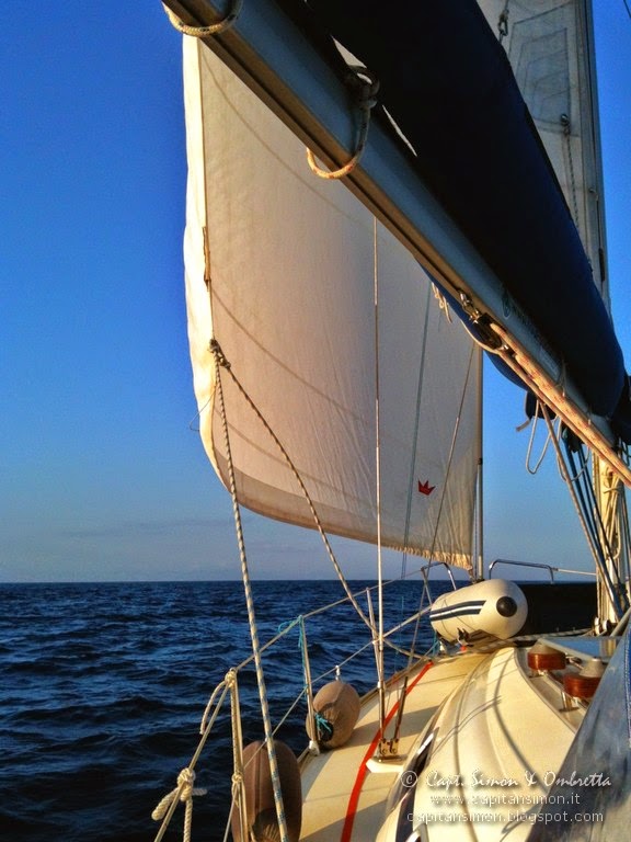 In effetti li il pannello prende sole pieno solo la mattina e il pomeriggio, quando l'angolazione fa diminuire il rendimento. Attorno a mezzogiorno, con raggi ben verticali, arriva l'ombra del boma a far crollare la resa..