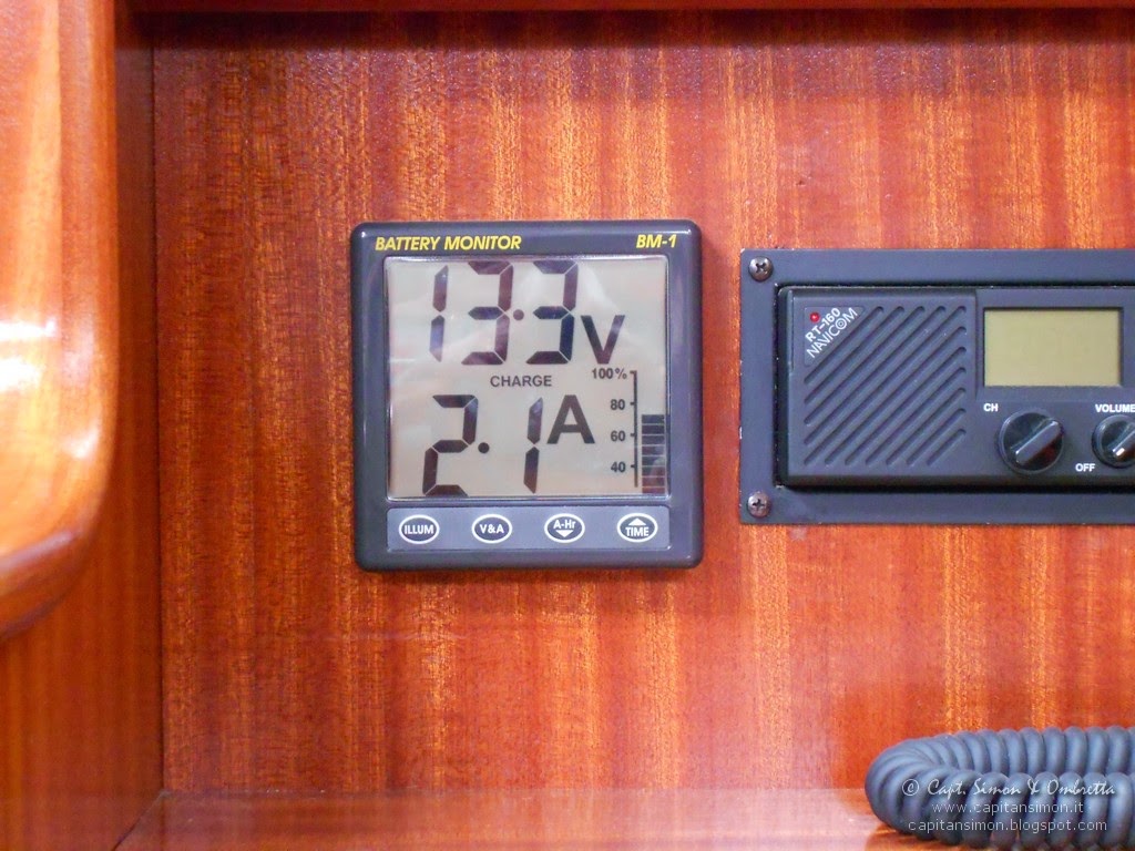 Il successivo, breve test durante i 5 giorni a Port Cros e la settimana in Corsica (prossimamente i racconti su questi schermi), hanno mostrato l'attesa carica limitata (a mezzogiorno, con l'ombra del boma più marcata ed invasiva, crolla a 0,8A, rispetto agli altrimenti accettabili 2-2,6A che si ottengono in condizioni migliori) ma più che altro, inaspettatamente, il crollo nella capacità di erogare corrente delle batterie servizi! Le due Crown Deep Cycle da 104 Ah l'una e con solo 3 anni all'attivo, dopo solo una quarantina di Ah di scarica netta mostrati dal NASA BM1, crollano sotto i 12V...