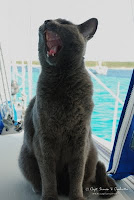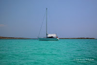 Nei giorni successivi, dal 9 all'11 agosto, decidiamo di fermarci alla rada della Pelosa, i giorni in porto son stati fin troppi, sentiamo ora il bisogno di "star fuori" in mare, sul mare! Alex di White Passion ci ha dato le coordinate precise per ancorare in un punto a ridosso dell'isola Piana, dalla sabbia buona tenitrice, riparato e comfortevole, oltre che paesaggisticamente a dir poco spettacolare. Arriviamo in loco col meteo non proprio esaltante, cielo grigiastro, luce soffusa e la catena dell'ancora pensa bene di adagiarsi a fianco di una specie di rottame residuo di ferro. Non voglio per nessun motivo aver impicci o problemi in caso di fuga rapida, quindi come sempre, decido per rifare l'ormeggio, controllando bene di aver campo libero per 360° attorno all'ancora. Comunque, cielo muffo a parte, questa calmissima e spettacolare rada alla Pelosa, piace anche alla nostra "Pelosa" di bordo! ;-)