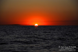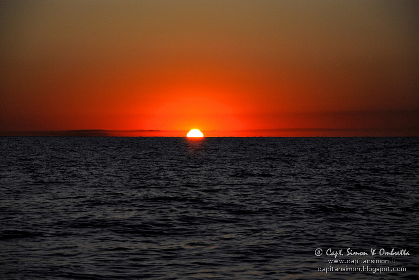 Per cena, mentre il sole si abbassa sull'orizzionte, panini in pozzetto, ben riparati dietro l'ampia capottina, mentre l'autopilota ST4000+ fa il suo dovere. In effetti l'aria non è proprio caldissima, considerando che in teoria questi dovrebbero esser i giorni più caldi dell'anno... In mare l'onda è un pò scomposta, ma nulla di che, aria indecisa, mai utile per poter spegnere il motore. I turni saranno i soliti di 3 ore: 9-24 per me, 24-3 Ombretta, 3-6 ancora per me e 6-9 per il Timoniere. Riuscirò a metter vela, nottetempo, solo per un'oretta, muovendomi ben allacciato a cintura, codrone e Jacklines.