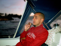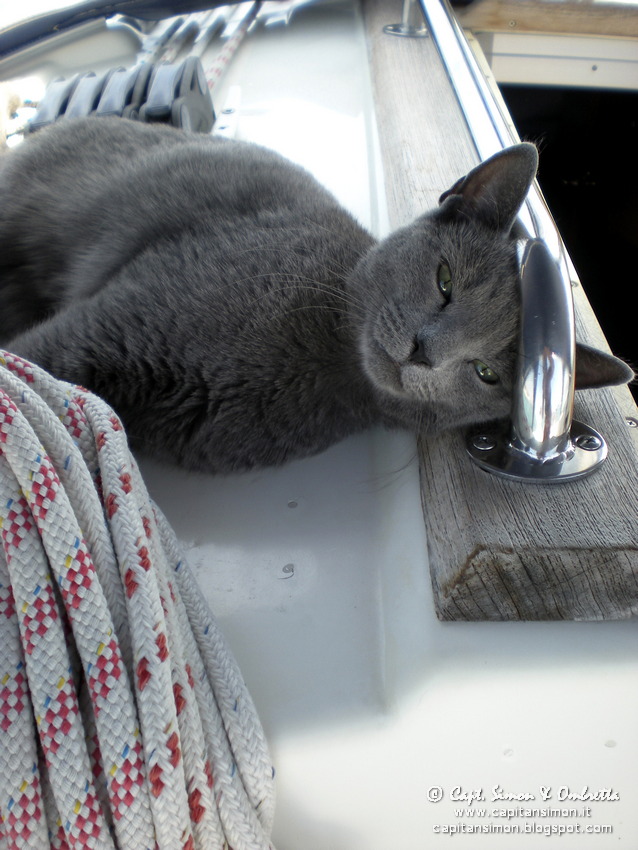 - Un grosso cabinato a motore, vecchio stile e con equipaggio vecchia età, ha provato a dare ancora nel solito tratto di sabbia alla mia prua. Gli comunico che "ovviamente" davanti a me, c'è la mia catena con la mia ancora, lui fa segno che ok, non c'è problema, si metterà di lato. Peccato che sarà troppo poco scostato e dando poca, pochissima catena, si troverà esattamente a fianco a noi, a dritta. Un pò in inglese, un pò in francese con l'aiuto di Ombretta, gli ripetiamo che è troppo vicino, c'è troppo vento per due barche quasi in linea che si trovano fianco a fianco a 4-5 mt di distanza! Tra l'altro io in previsione di star sicuro e fermo ho dato molto calumo (o meglio, il giusto), loro, se va bene avranno una quindicina di metri di catena... su 4 metri ma con quel vento in rinforzo è davvero poco! I vecchiardi di bordo ragionano lentamente, molto lentamente e dopo mezz'oretta realizzano: "forse" sono troppo vicini! Vecchiardo 1 alle manette dei due motoracci, vecchiardo 2 all'ancora. La manovra di recupero sulla loro ancora mi preoccupa, li vedo troppo rigidi, lenti ed impacciati... e infatti, il tempo di correre a prua e la barcaccia, appena solleva l'ancora dal fondo, spinta dal forte vento in un attimo è scaraventata sulla nostra prua! Il vecchiardo 1, a quel punto pensa bene di dare tutto gas a tutte e due le manette, impennando la barca sulla nostra prua e agganciando la nostra catena con la sua ancora a penzoloni. A quel punto vecchiardi mariti e vecchiarde mogli vanno in panico, sgasate senza senso e senza idee sui motori, strattoni alla nostra prua. Se non faccio qualcosa in un attimo strapperanno anche la nostra catena con quel loro catafalco grosso, alto e pesantissimo! Non voglio finire a scogli trainato dalla loro deficienza! Tra le urla delle vecchiarde che temono chissà cosa e le mie che con tutto il fiato che ho in corpo (e, credo, sguardo assassino...) gli grido: "At home!!! You've to stay at home!!! Stupid, bad stupid!!! Why are you here on the sea?!? Stay at home, go at home!!!" mi tuffo a prua e in un attimo, pur con un bello sforzo, riesco a far scavallare la loro ancora a destra della nostra catena. Sono quei momenti i cui rimpiangi di non sapere bene una lingua per non poter insultare a dovere l'imbranato di turno! Subito la barcaccia, non più agganciata a noi, scade velocemente a dritta, mentre Ombretta, provvidenzialmente, ha già buttato giù tutti i parabordi che quest'anno abbiamo deciso di lasciare al loro posto, semplicemente sollevati da un gancetto. Estetica a parte, ottima scelta! L'unico danno riportato, così, sarà una storta all'archetto di fissaggio del bompresso in acciaio... spero almeno di avergli lasciato un giusto ridordino in fiancata! Quanto meno, raccogliamo le loro terrificate, sincere scuse. A quel punto, abbandono il ghigno assassino, mentre loro piano si allontanano, riesco a dargli un cenno di ok, con aggiunta di un: "next time, take care of the distance and the wind!". Vabbè, con tutta l'incompetenza che ormai gira per mare, un incidente del genere prima o poi era inevitabile. Poteva andar peggio!