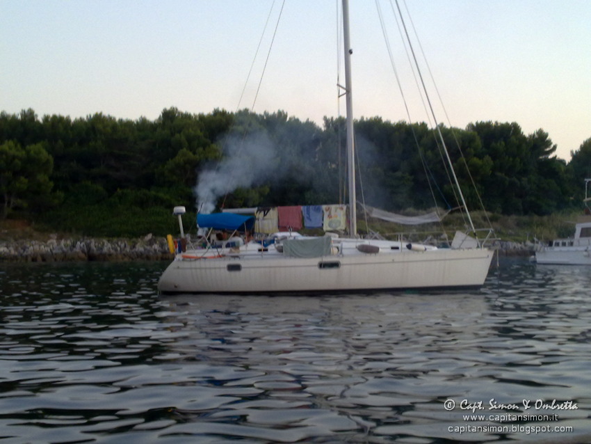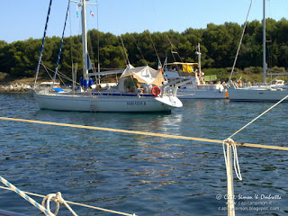 L'acqua finalmente è un pò meno gelida rispetto a quella sorbita a Porquerolles: vedere il tridata in consolle e il Suunto D4 al polso indicare 22-23 gradi è quasi un sogno! Un solo motivo di sconcerto: trovo l'ancora completamente fuori dal fondo che non è sabbia come credevamo, bensì uno strano feltro compatto, di sabbia durissima tenuta assieme da fibre vegetali... La Delta tiene solo perchè l'apice del vomere è impuntato sotto un impercettibile gradino! Così non si dorme! Ma per fortuna nostra, appena arriva il tardo pomeriggio, constatiamo con estremo piacere il previsto fuggi fuggi dei diportisti e riusciamo a cambiare l'ormeggio anche se di soli pochi metri. Per brutto che sia, meglio dare ancora sulla posidonia (la Delta buca abbastanza bene i rizomi al contrario delle varie Danforth/Brittany/Fortress o bruce che siano) piuttosto che su quell'infido feltrone. Segue un aperitivo spettacolare, una cena a base di gustosissimi speck e uova in padella e un dopo cena davvero piecevolissimo in pozzetto (anche l'aria sta cominciando a scaldare, finalmente con temperature degne del mese di agosto). Unico molestissimo detaglio, la barca a noi vicina, che spudoratamente griglia a tutto andare carne e pesce sul magma di bordo... invidia, fortissima invidia!!!