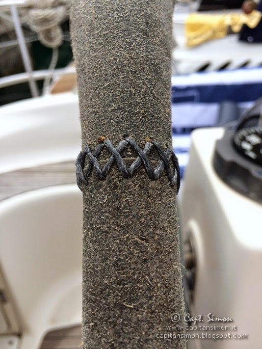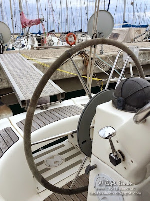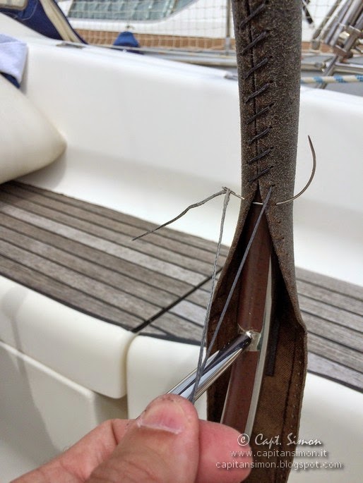 Decido quindi per un lavoro in arretrato, prima che il caldo e il sole rovente lo rendano antipatico: rifare le cuciture del cuoio della ruota timone. La bellissima pelle scamosciata (strano... su un Bavaria!) è infatti ancora in ottimo stato, mentre le pur bellissime cuciture a doppio ago incrociate si erano lasciate andare in più punti. Lavoro noiosetto, che ha richiesto un minimo di pratica iniziale (farò un post specifico prossimamente), allietato con birretta fresca e patatine, ma per il resto concluso con tutta calma prima dell'aperitivo serale in pozzetto a base di pastis!