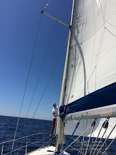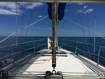 Tutta randa, un poco sventata, genoa rollato a fiocco e autopilota, ci godiamo comunque qualche minuto di bella veleggiata, nonostante qualche onda ripida da Est che si scompone su quelle residue da SW. Non proprio il massimo del mare, ma almeno ci godiamo il vento... finché dura!