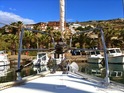 Avvolgiamo il genoa, quasi sotto al porto, accendiamo il motore e puntiamo la rada a fianco di Aregai. Giù la randa nel mai sufficientemente lodato lazy bag e collaudiamo il nuovo comando dell'ancora a colonnina, dando fondo su 6 metri di sabbia.