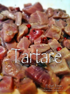 La cena per quattro, vede sempre il nostro tonno protagonista, questa volta prima in tartare con salsa di soia e maionese, poi rosolato ad alta temperatura in padella, con olio, aglio e vino rosé, per dorarlo fuori, lasciando il cuore quasi crudo, accompagnato con peperoni e pomodori.