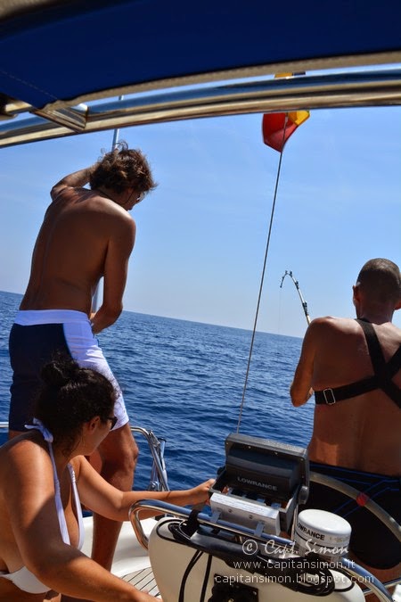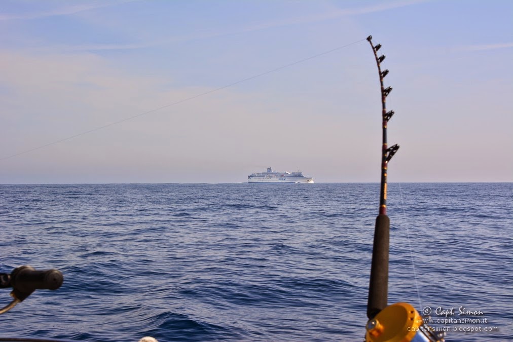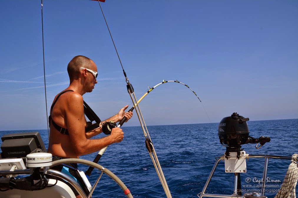 Avviso l'equipaggio che non sarà facile, che con questa canna (12-20 lbs) e questa lenza (20 lbs) su una barca a vela così piccola ed ingombra di paterazzi sdoppiati, pulpiti, timone profondo etc. portarlo al raffio sarà difficilissimo. E sopratutto, che se anche dovessimo riuscirci, il pesce potrebbe esser "troppo grosso" per la nostra barca!