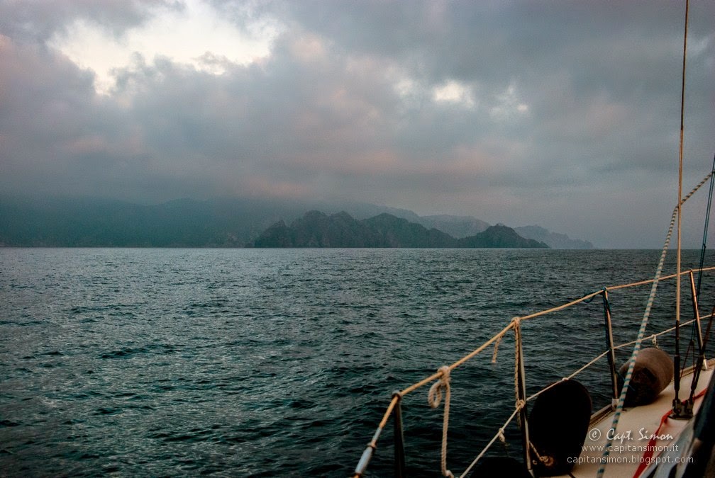 Man mano che il profilo della costa si angola e scade, l'onda lunga perde forza e intensità, si attenua rapidamente, fino a lasciarci navigare in un mare quasi calmo.