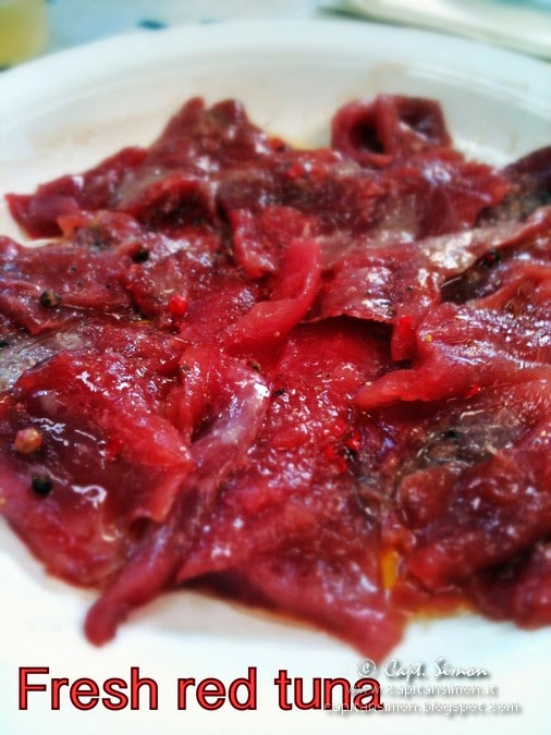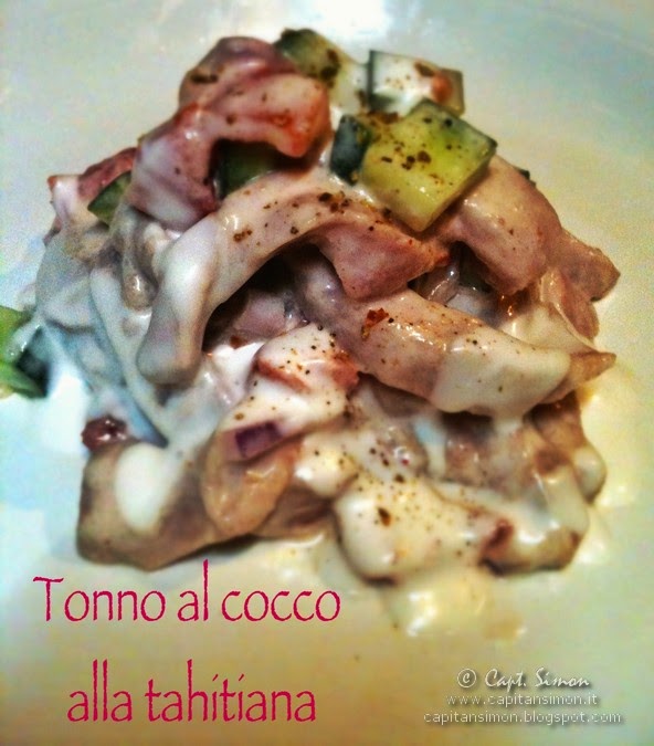 E la sera, altra cena a base di tonno che questa volta, grazie all'ottima conservazione garantita dal frigo potente e dal sottovuoto applicato ai grossi filettoni, ci delizia con una tartare condita con olio, succo di lime, pepi creoli e bacche rosse e quindi con un bel piatto di tonno alla polinesiana, con crema e latte di cocco, forse il top per gustare questa carne così speciale.