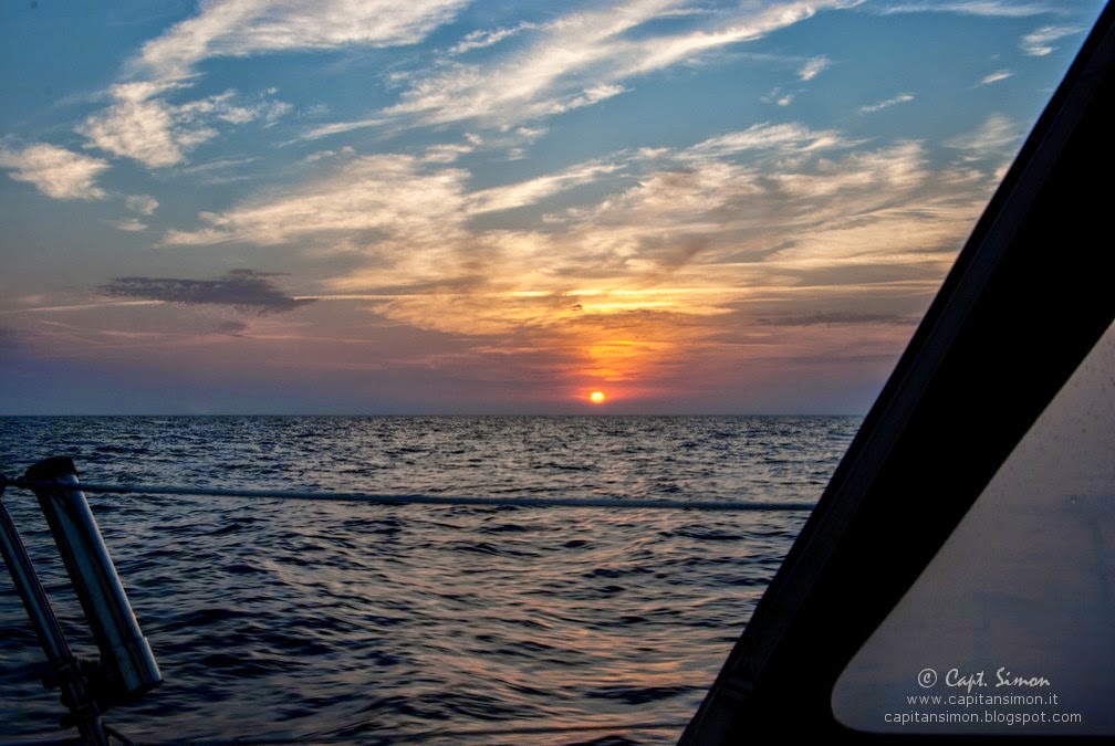 Navighiamo col vento in attenuazione, dopo 4 ore di gagliarda veleggiata. Bellissimo lo spettacolo dell'alba, con sole dai colori caldi a levante e la fredda luce lunare a ponente! In pratica, ci si ripropone al contrario lo spettacolo ammirato la sera scorsa...