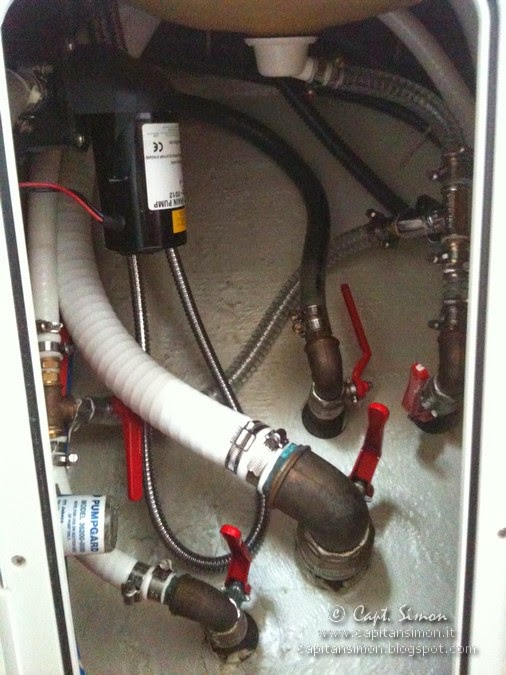 Nel pomeriggio io mi dedico ad un lavoro in programma da tempo: collegare lo scarico del lavello del bagno all'ingresso (carico) del WC. In questo modo, agendo su varie valvole, si può chiudere l'aspirazione di acqua marina del WC, caricando invece acqua dolce (con eventuali aggiunte di disinfettanti etc) direttamente dal lavello. In questo modo, in caso di sosta prolungata, in tutti i tubi del WC si lascerà acqua dolce e non salata, eliminando totalmente l'odore di zolfo che per anossia si forma nei tubi del WC in caso di inutilizzo. Su Lady Blues il lavoro è risultato estremamente facilitato dal raggruppamento di progetto di tutte le valvole esattamente all'interno del mobiletto sotto il lavello. Dopo un anno, garantisco un'efficacia TOTALE! Niente più tracce di odore di zolfo!